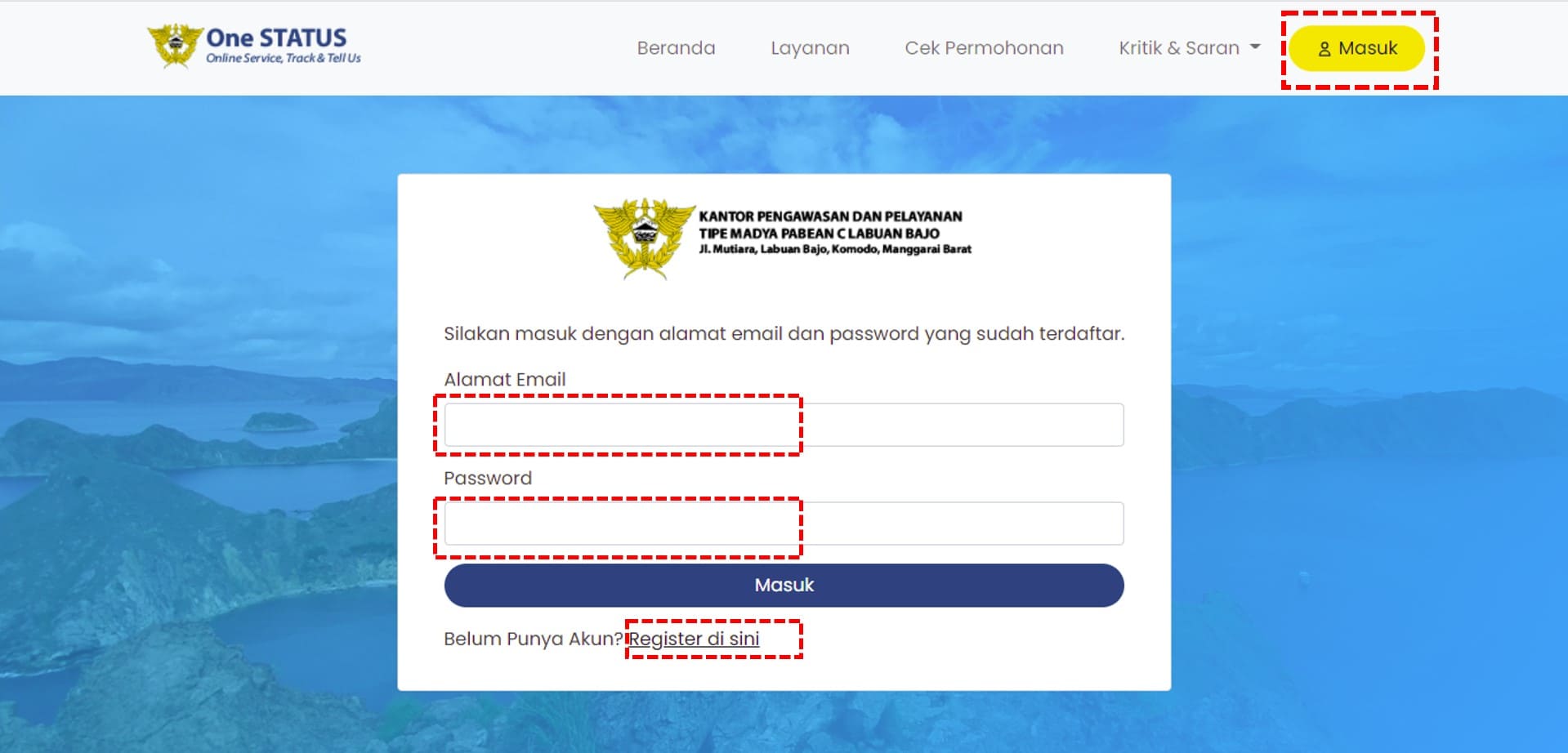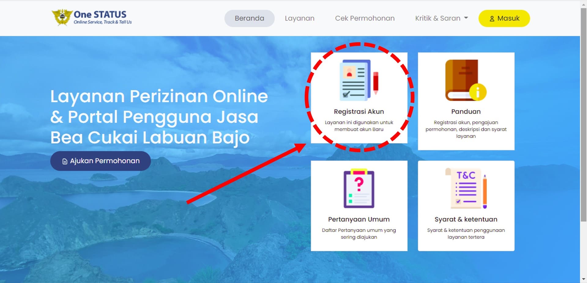 Untuk dapat mengajukan permohonan, terlebih dahulu wajib melakukan “Registrasi Akun” dan “Masuk” (login).