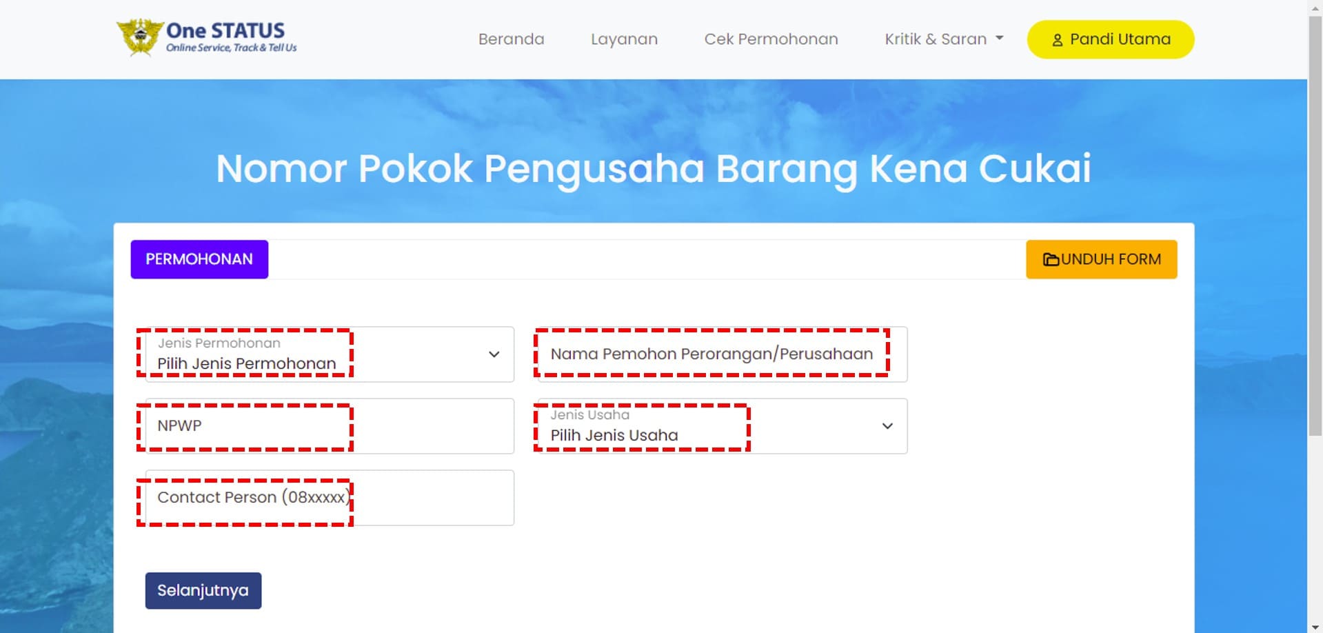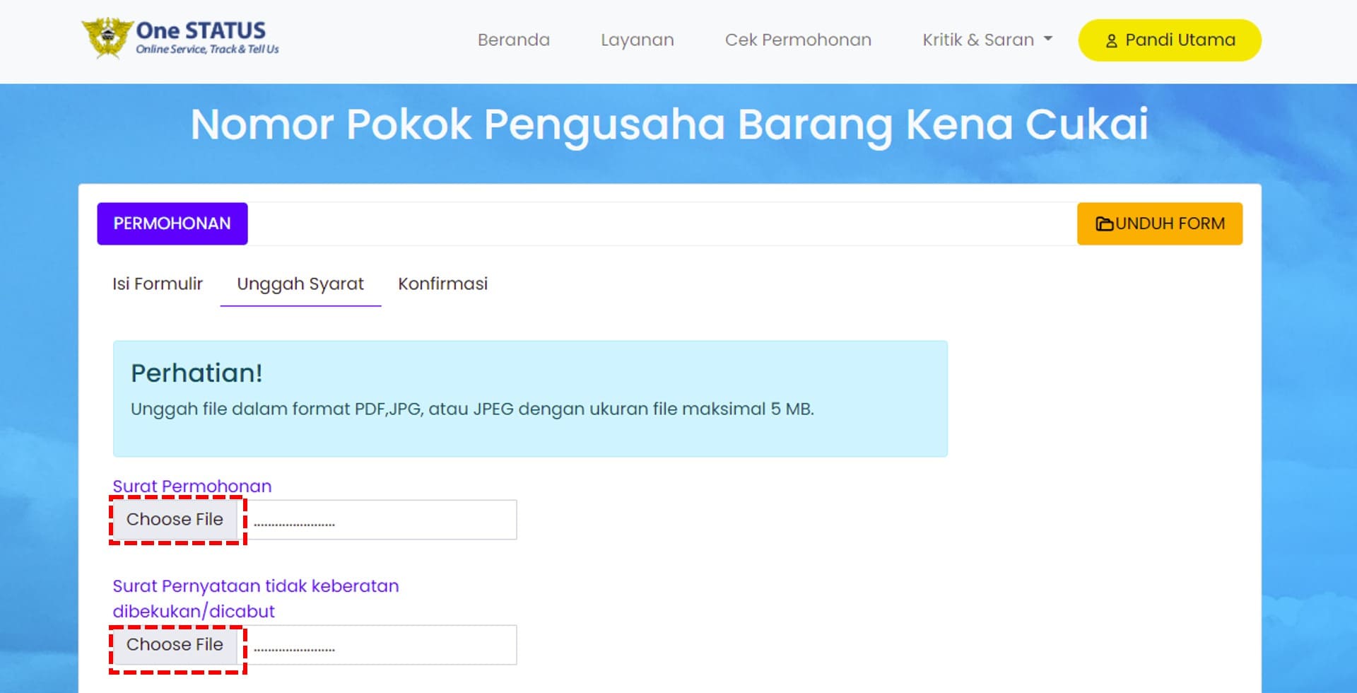 Sebelum melakukan pengisian formulir dan syarat layanan, Pemohon dapat mengunduh contoh surat atau gambar melalui tab “Unduh Form”.
