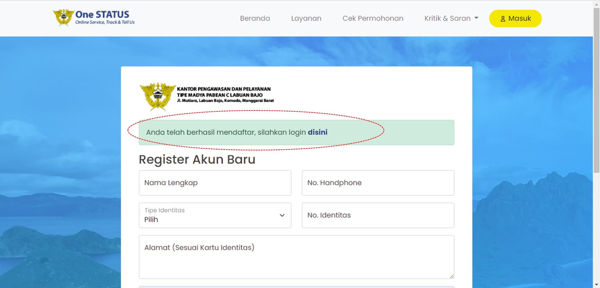 Sebelum anda dapat menggunakan fitur-fitur One STATUS, anda diwajibkan untuk memiliki akun One STATUS. Silakan pilih tab “Registrasi Akun” atau melalui tab Masuk klik “Register di sini”.