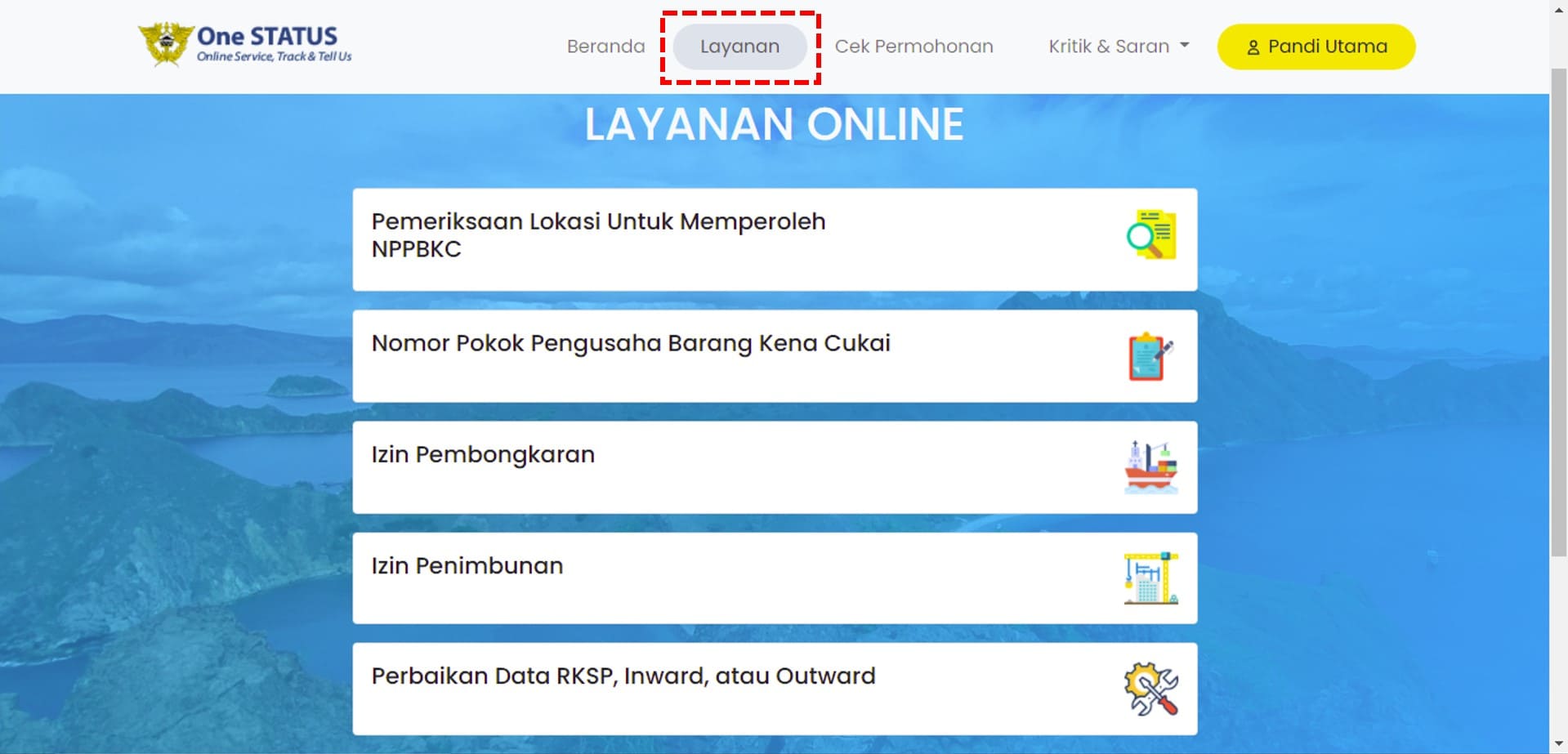 Pemohon mengajukan permohonan dengan memilih jenis layanan online yang tersedia.