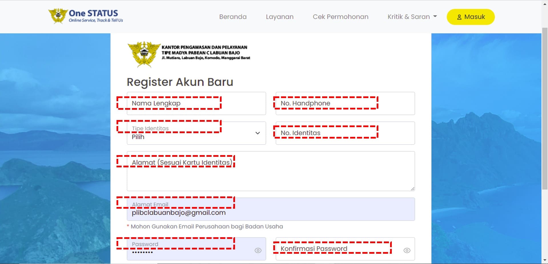 Pada halaman Register Akun Baru, silakan mengisi kolom-kolom formulir data anda dengan lengkap dan benar. Untuk Badan Usaha, harap menggunakan alamat email perusahaan.