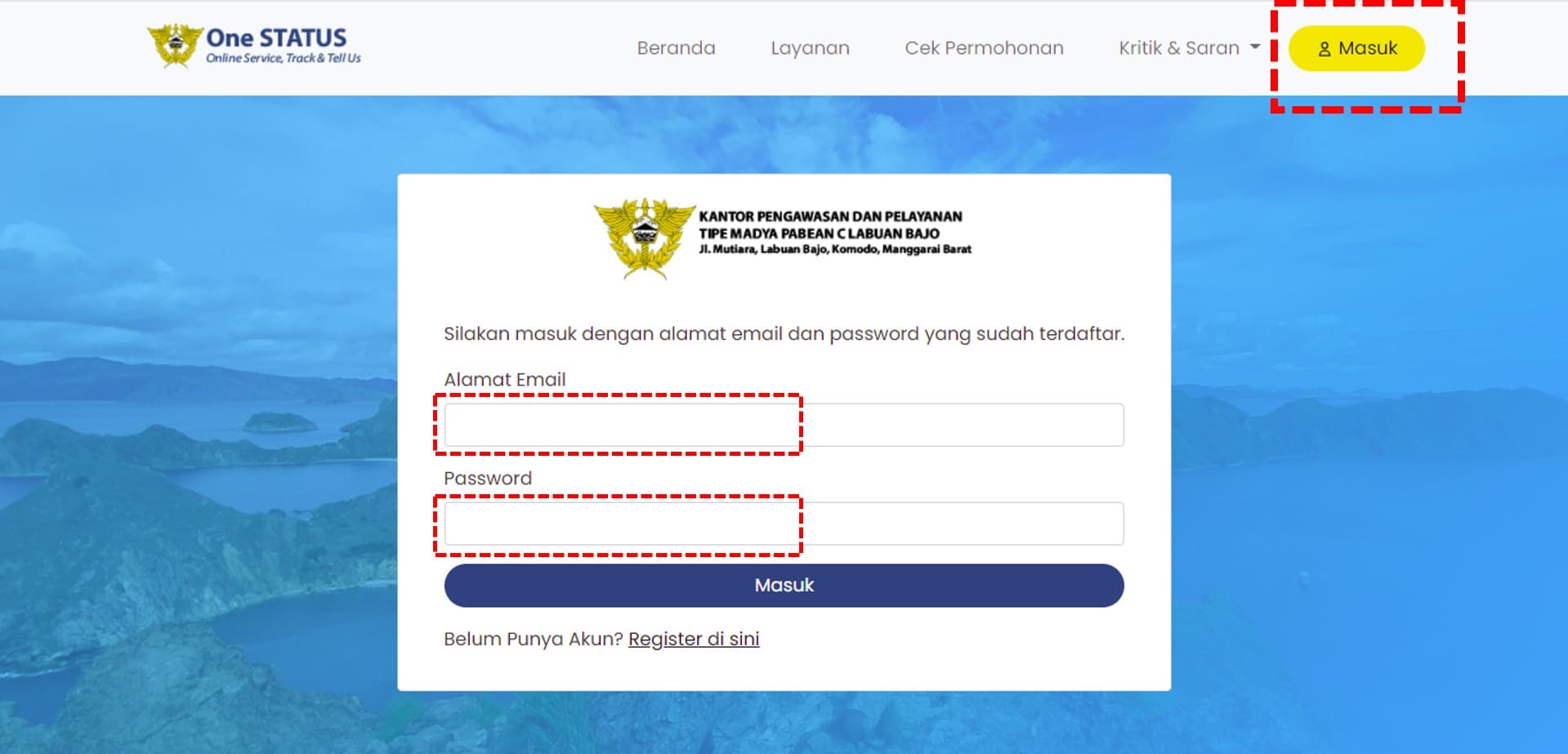 Setelah berhasil melakukan proses registrasi akun, silakan untuk masuk (log in) dengan mengisi email dan password yang telah didaftarkan untuk dapat menggunakan layanan dan fittur pada aplikasi One STATUS.