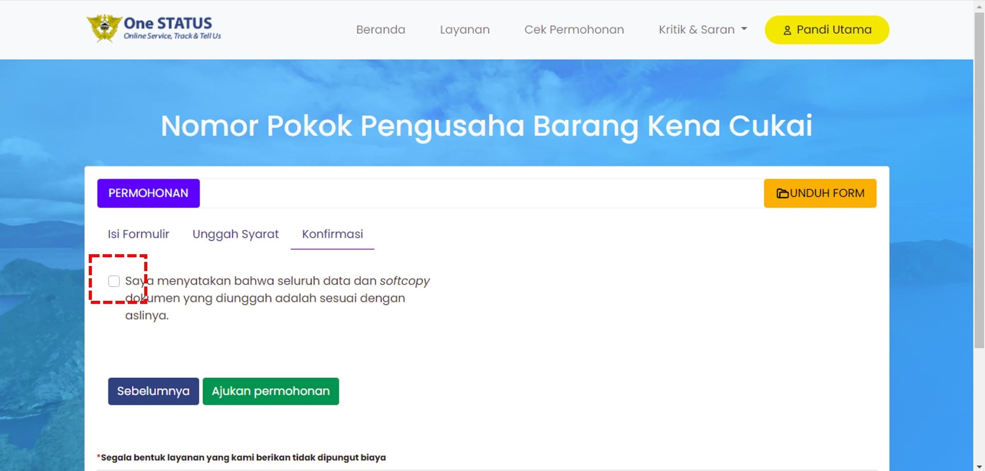 Setelah Pemohon mengisi formulir dan mengunggah dokumen persyaratan dengan lengkap, Pemohon akan menuju ke halaman “Pernyataan Pemohon”. Silakan centang kotak pernyataan jika ingin melanjutkan proses permohonan.