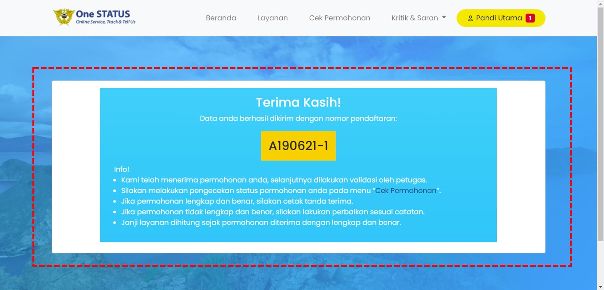 Selamat, Pemohon telah berhasil mengajukan permohonan dan mendapat nomor pendafaran. Selanjutnya permohonan akan dilakukan validasi oleh petugas Bea dan Cukai.